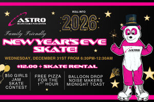Join us for our family friendly New Year's Eve Skate! Free pizza for the first hour!